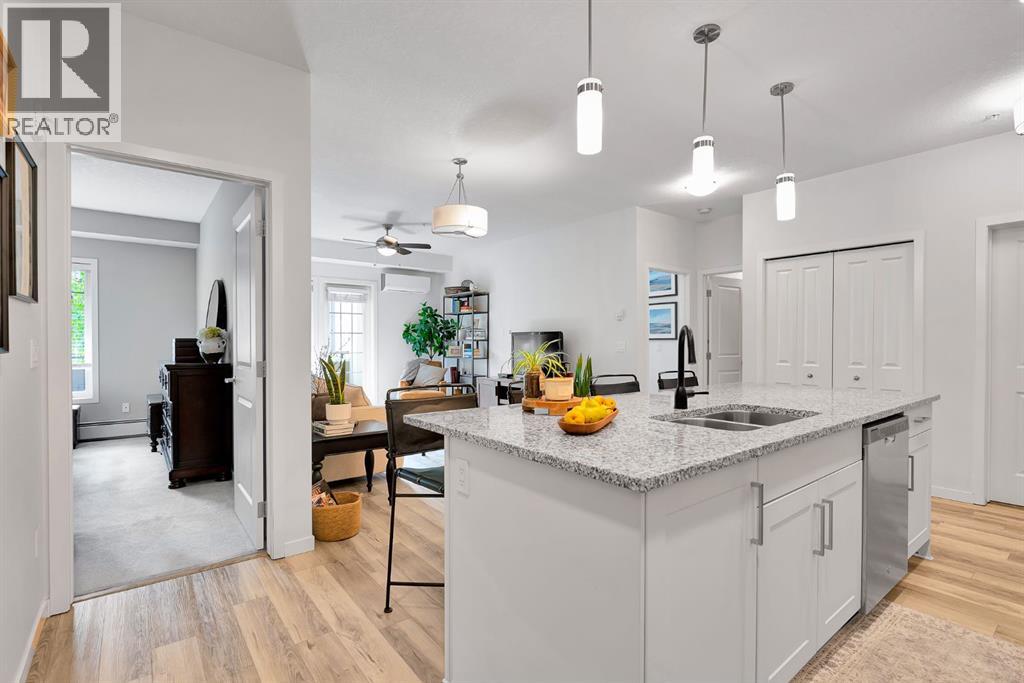 Welcome to this meticulously maintained, luxury 2-bedroom, 2-bath condo in the desirable Sandgate complex of Mahogany, just steps from the beach and lake. Boasting 965 sq.ft. of beautifully designed living space, this south-facing 2nd-floor unit is flooded with natural light and framed by mature trees, offering privacy and a serene sanctuary. Inside, enjoy an open-concept layout connecting the living, dining, and kitchen areas—perfect for entertaining. The kitchen features white cabinetry, a stainless steel appliance package with an upgraded double stove, and ample built-in storage solutions. Recent updates include new LVP flooring, fresh paint, and an upgraded shower with a sliding glass door in the ensuite. The spacious master suite offers a walk-through closet leading to a stunning 3-piece ensuite, while the second bedroom provides flexibility for guests or a home office. Step out onto the semi-enclosed private balcony, complete with natural gas hookups for summer BBQs. Additional highlights include underground heated titled parking & storage, a fully equipped resident only gym, and a thoughtfully maintained community. This exceptional home combines style, comfort, and convenience—don’t miss this opportunity! (id:21083)