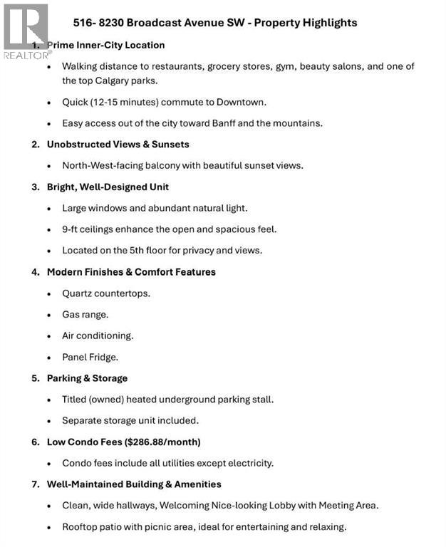 Prime Convenient Location *** Walking Distance To Restaurants, Grocery Stores & Parks *** Quick Commute To Downtown *** Easy City Access Toward Banff, Bragg Creek & Mountains *** North-West Facing Balcony *** Sunset and Mountains Views *** Bright Unit With Large Windows *** 9-Ft Ceilings *** 5th Floor Location *** 2 Bedrooms *** 4-Piece Bathroom *** Quartz Countertops *** Gas Range *** Panel Fridge *** Central A/C *** In-Suite Laundry *** Titled Heated Underground Parking *** Separate Storage Unit *** Bike Storage *** Low Condo Fees (Utilities Included Except Electricity) *** Clean Wide Hallways *** Rooftop Patio With Picnic Area *** Built In 2025 *** West District Location *** Walking Distance To Shops, Cafés & Parks (id:21083)