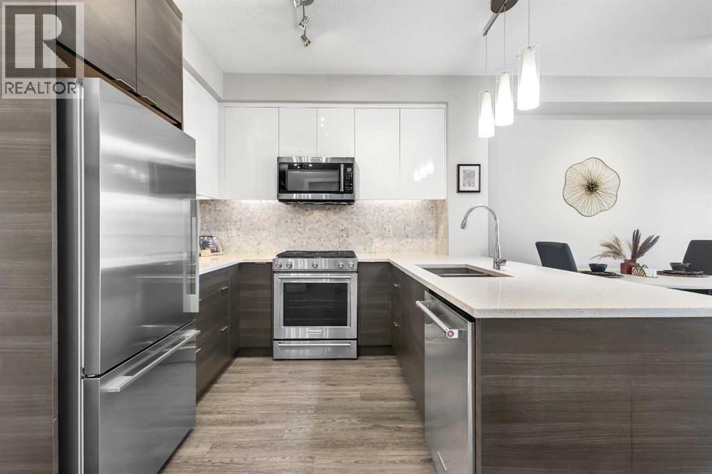 Discover the perfect blend of style and convenience in the highly sought-after SW community of Currie Barracks. This stunning 700+ sq. ft. residence in a prestigious complex offers a sophisticated urban lifestyle, perfect for first-time buyers and savvy investors alike. The heart of this home is a bright, open-concept living area featuring durable laminate flooring and a seamless flow. Natural light pours in through large sliding glass doors that lead to your spacious private balcony - an ideal spot for morning coffee or evening relaxation. Prepare to be impressed by the sleek, modern kitchen featuring contemporary cabinetry, stylish tile backsplash, premium stainless-steel appliances, elegant quartz countertops and a large kitchen island. There are two generous bedrooms: Including a primary suite complete with a spacious walk-in closet. A refined 5-piece bathroom and dedicated laundry area provide convenience for all occupants. Enjoy the perks of a well-maintained complex that include access to a car wash bay, secure bicycle storage, and ample visitor parking for your guests. Located in one of Calgary’s most vibrant neighborhoods, you are minutes away from the trendy shops and dining of Marda Loop. A quick drive to Downtown Calgary and easy access to public transit. Walking distance to Mount Royal University and top-rated local schools. Experience the best of SW Calgary living. Schedule your private viewing today! (id:21083)