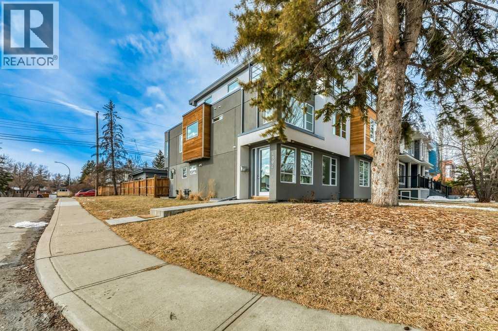 Welcome to this exceptional luxury infill in the desirable inner-city community of Glenbrook, offering over 3,000 sq ft of developed living space with 4 bedrooms and 5 bathrooms on a large corner lot with sunny south and west backyard exposure that fills the home with natural light throughout the day. The open-concept main floor is designed for both everyday living and entertaining. The stunning chef’s kitchen features high-end stainless steel appliances including a gas cooktop, extensive contemporary cabinetry, a marble backsplash, and a massive quartz island with waterfall edge and double-thick edge detail. The bright living room overlooks the backyard and is anchored by a sleek linear fireplace, creating a warm and inviting space. Walnut hardwood flooring runs throughout nearly the entire home, including the upper levels and basement living areas. The second floor offers three bedrooms, a full bathroom, convenient laundry, and mountain views. The spacious primary suite features a walk-in closet with built-ins and a spa-inspired ensuite with heated floors, double vanity, glass shower, and deep soaker tub beside a large window that fills the room with natural light. The entire third floor is a standout entertaining space, offering a bright and versatile lounge area complete with a wet bar, beverage fridge, and 2-piece bathroom. Step outside to the private balcony with gas hookup, perfect for relaxing or entertaining. The professionally developed basement includes a large recreation area with built-in wet bar, a fourth bedroom, and a full bathroom, along with in-floor slab heating for year-round comfort. Additional highlights include a double detached garage with 220V outlet for EV charging. Ideally located close to parks, schools, restaurants, and shopping at Westhills and Signal Hill Centre, with quick access to Richmond Road and Sarcee Trail and approximately an 8-minute commute to downtown Calgary. (id:21083)