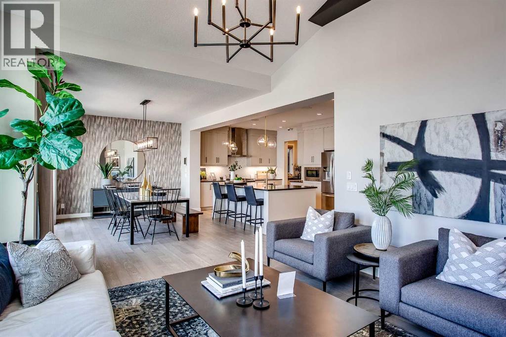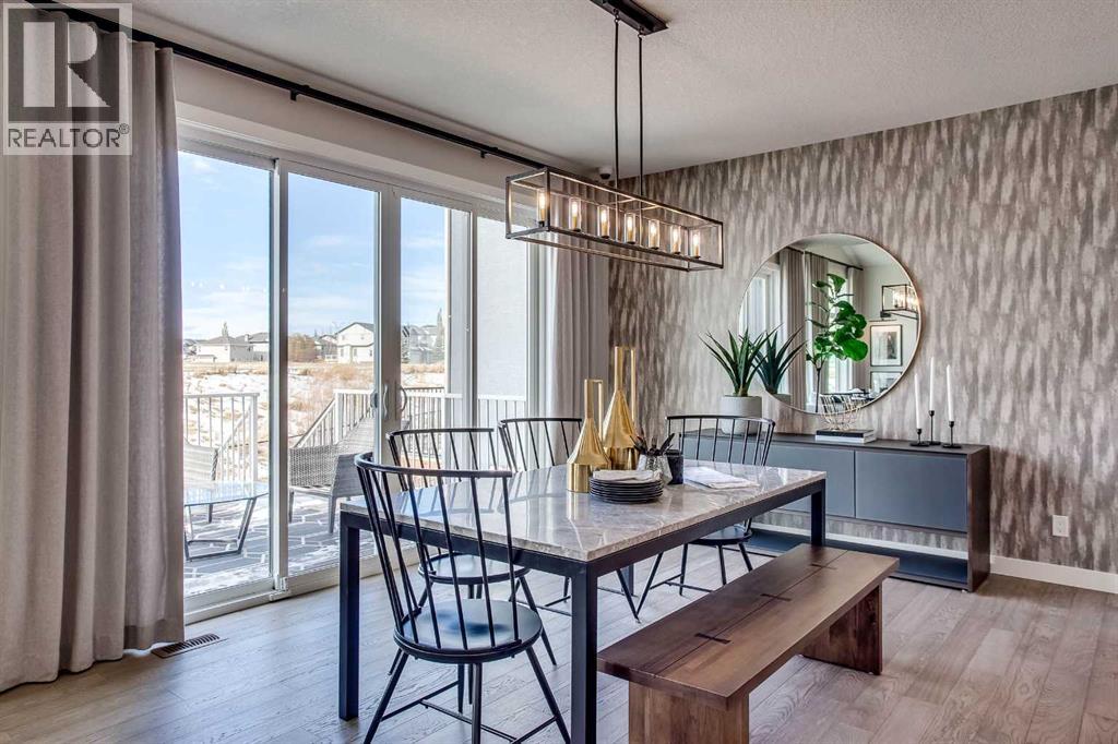 Exquisite Former Show Home with Majestic Mountain Views. Welcome to the "Hennessy III" by Calbridge Homes, an award-winning former show home where sophisticated designer upgrades meet an unparalleled lifestyle location. Backing onto a serene green space with a coveted west-facing backyard, this residence offers a front row seat to breathtaking Rocky Mountain sunsets. The interior is bathed in natural light, highlighted by wide-plank hardwood floors and custom designer lighting throughout an open-concept layout masterfully planned for both intimate family life and grand-scale entertaining. The gourmet chef's kitchen serves as the heart of the home, featuring full-height cabinetry, a massive breakfast bar island, premium stainless steel appliances with a gas range, and a substantial butler's pantry for seamless organization. In the grand great room, soaring vaulted ceilings with wood beams and a tiled fireplace create a sense of scale, while a signature wall of windows perfectly frames the outdoor oasis. For those seeking a quiet workspace, elegant French doors lead to a dedicated den perfect for a sophisticated home office. The upper level is a true sanctuary of comfort, led by a primary retreat featuring a massive walk-in closet and a spa-inspired ensuite with dual vanities, an oversized shower, and a deep soaker tub. A versatile central bonus room offers the ideal loft space for movie nights, complemented by three additional bright bedrooms, a full family bathroom, and a conveniently located laundry room. The professionally finished basement significantly extends the living space, offering a massive recreation area and a fully equipped wet bar with a beverage fridge. A large fifth bedroom and full bathroom provide a private suite for guests or older children. Complete with a generous triple-car garage, this home is close to the incredible walking paths that lead you throughout the parks and playgrounds this community has to offer. Enjoy unbeatable convenience being just minutes from the C-Train, YMCA, community center, and a vibrant array of local shops and dining. Experience the pinnacle of craftsmanship and scenery in this rare property. Call today for your personal viewing. (id:21083)