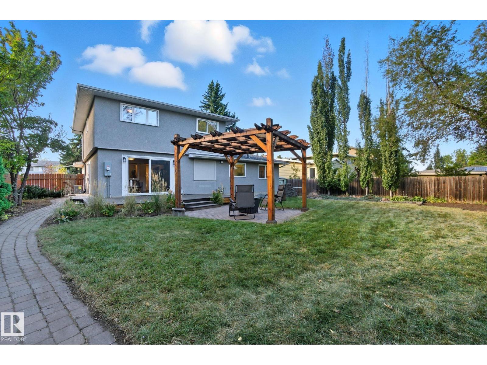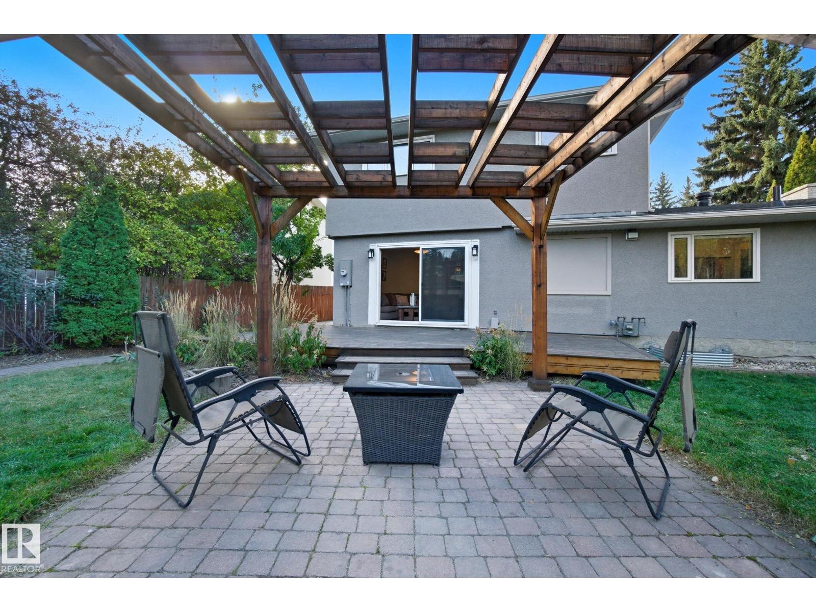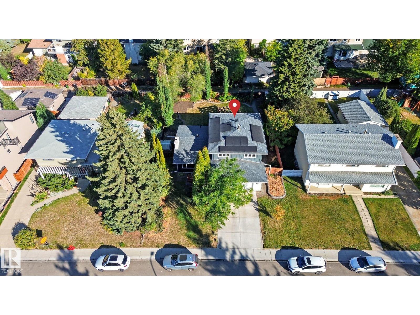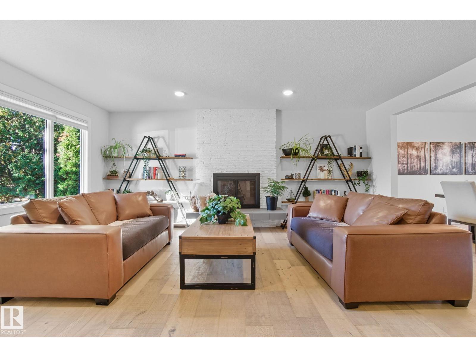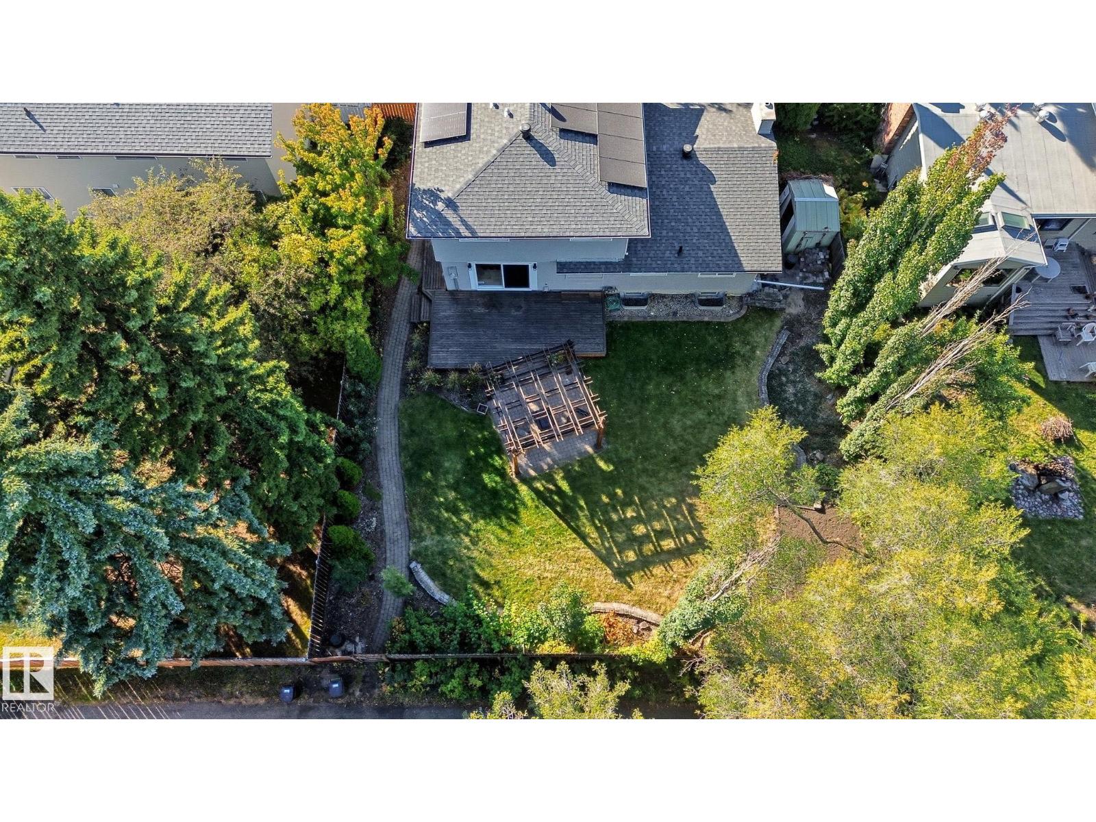 Solar-powered and fully renovated, perfectly positioned in one of Edmonton’s most desirable communities with Whitemud Ravine views right outside your front door. Paid-in-full solar panels efficiently run the heat pump and central A/C, plus a backup furnace, keeping comfort cost-effective year-round. Inside, modern updates blend with timeless style. The bright kitchen offers white cabinetry, quartz countertops, stainless steel appliances, and a large peninsula with seating, opening to the dining area. A wood-burning fireplace anchors the living room, while the family room leads to a private, fully fenced spacious backyard with deck and mature trees. Upstairs is a rare find with 4 generous sized bedrooms, including a primary suite and full ensuite. The finished basement adds a large rec room, bedroom, full bath, and storage. Additional features include main floor laundry, Hardie board exterior, new upstairs carpet, alley access with potential for a garden suite. (id:21083)