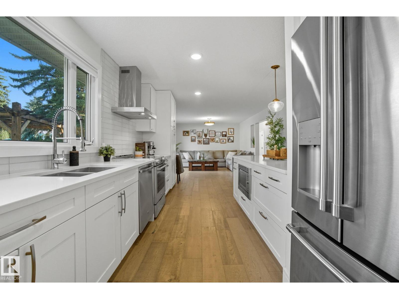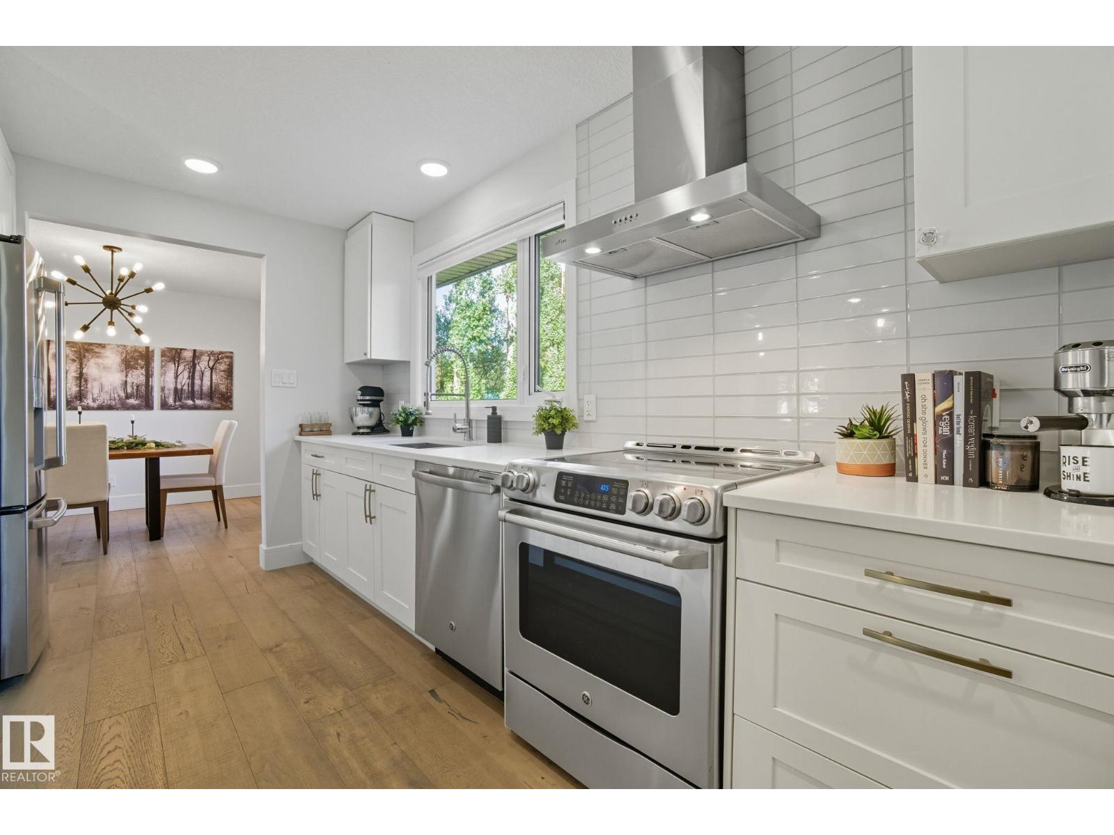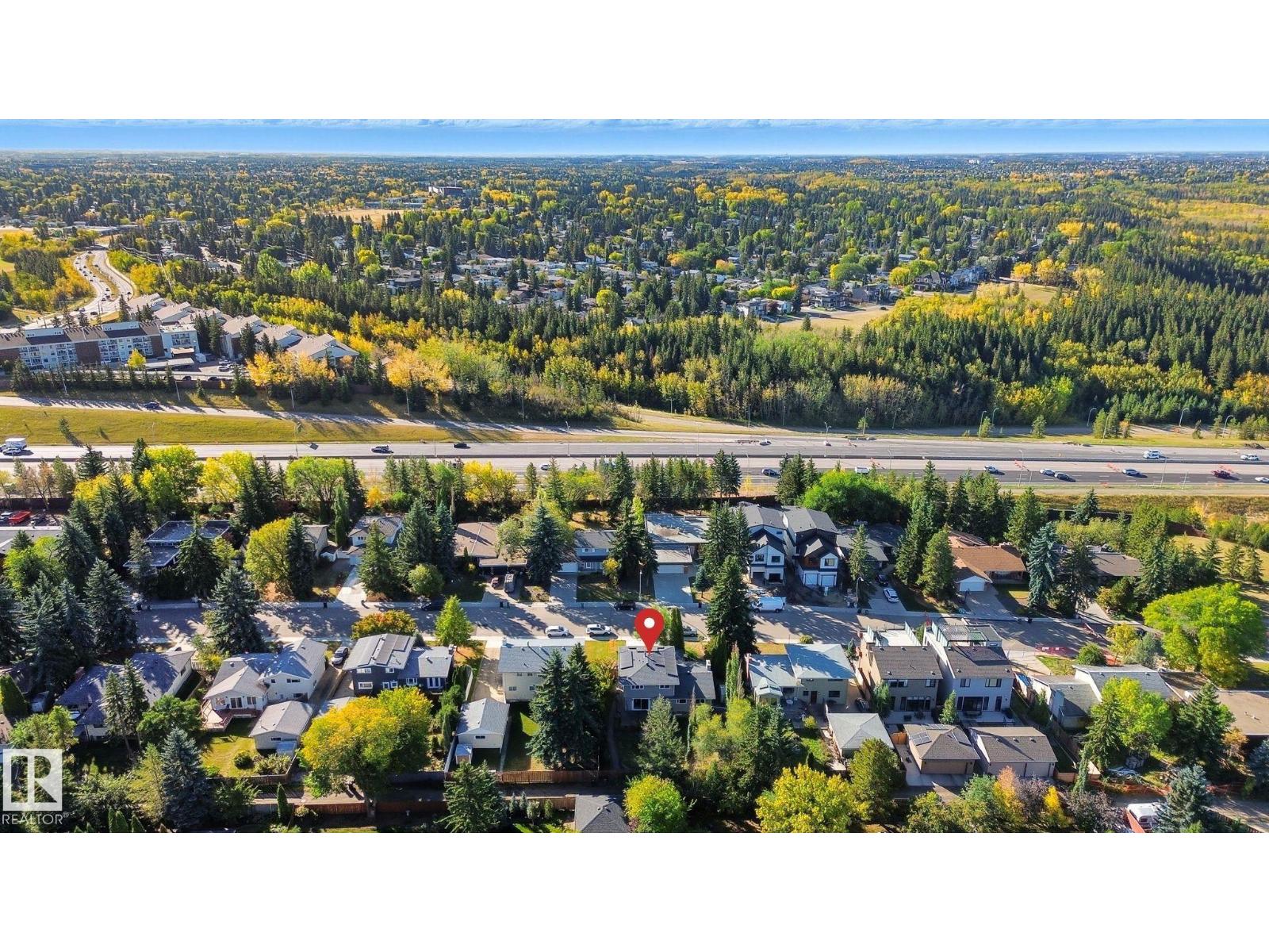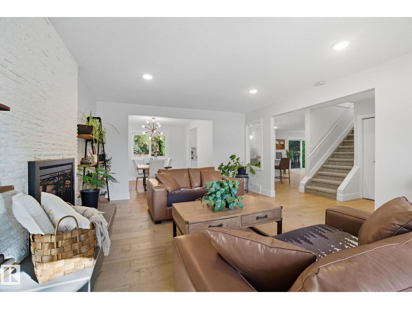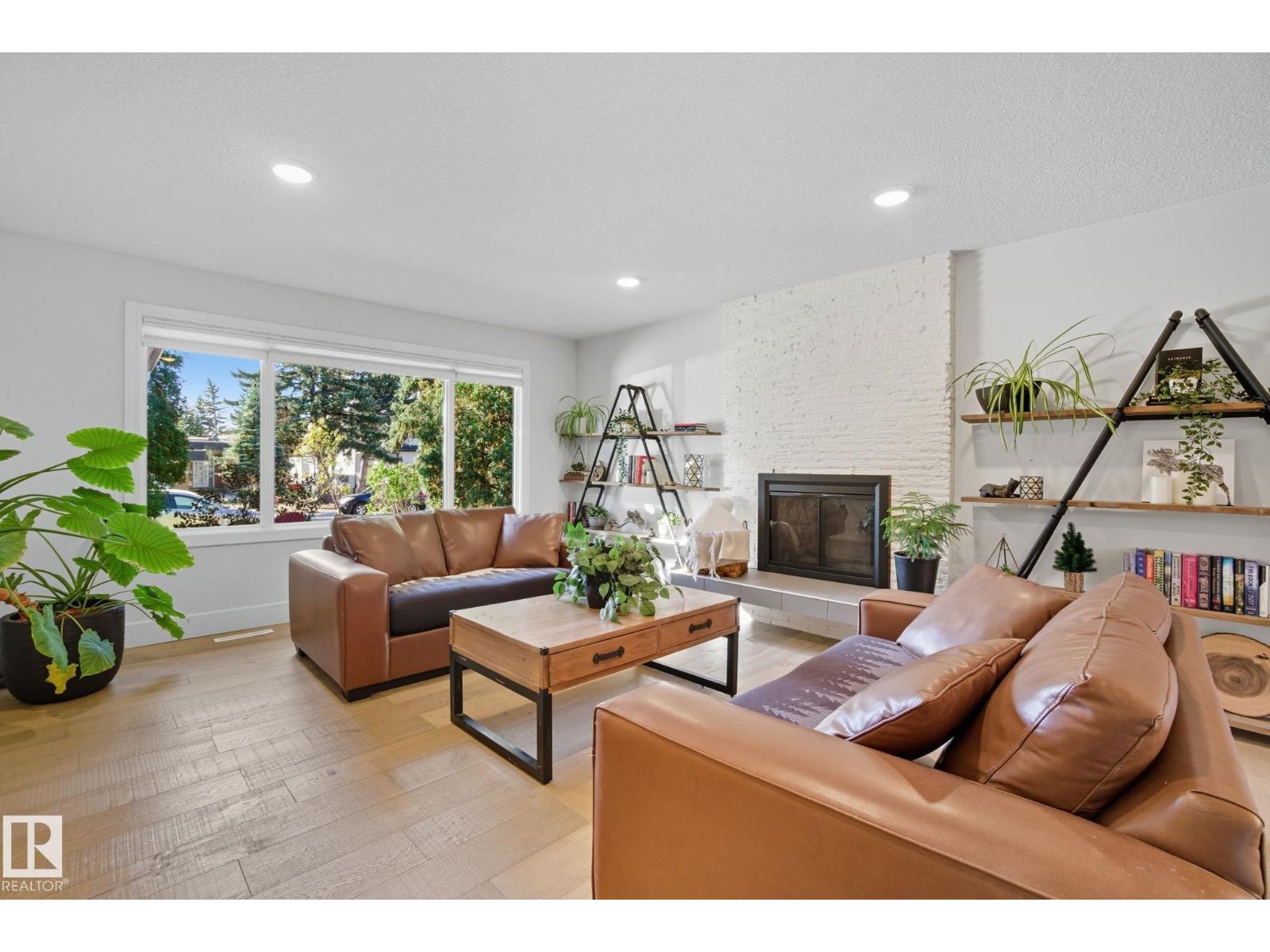 Solar-powered and fully renovated, perfectly positioned in one of Edmonton’s most desirable communities with Whitemud Ravine views right outside your front door. Paid-in-full solar panels efficiently run the heat pump and central A/C, plus a backup furnace, keeping comfort cost-effective year-round. Inside, modern updates blend with timeless style. The bright kitchen offers white cabinetry, quartz countertops, stainless steel appliances, and a large peninsula with seating, opening to the dining area. A wood-burning fireplace anchors the living room, while the family room leads to a private, fully fenced spacious backyard with deck and mature trees. Upstairs is a rare find with 4 generous sized bedrooms, including a primary suite and full ensuite. The finished basement adds a large rec room, bedroom, full bath, and storage. Additional features include main floor laundry, Hardie board exterior, new upstairs carpet, alley access with potential for a garden suite. (id:21083)