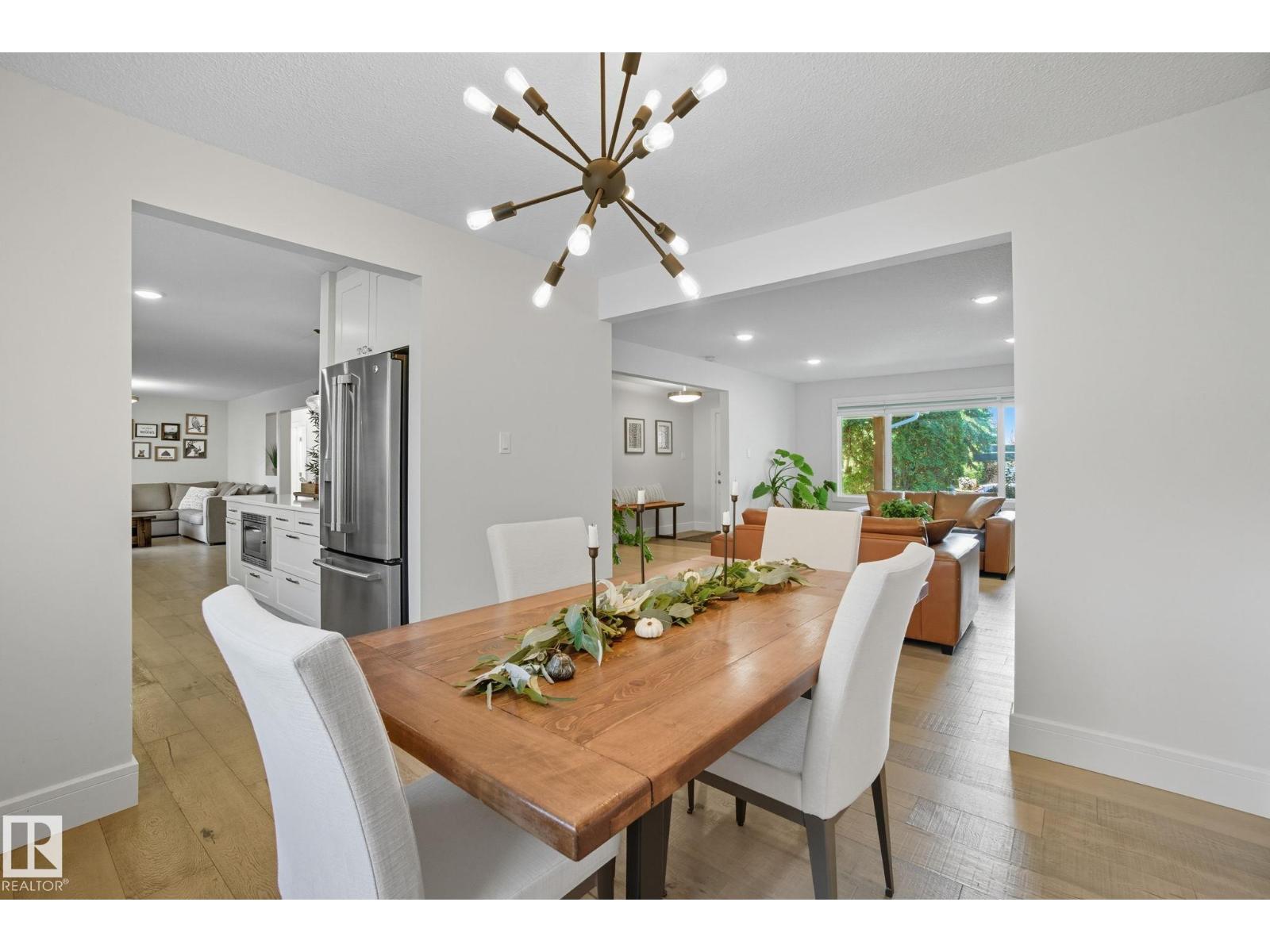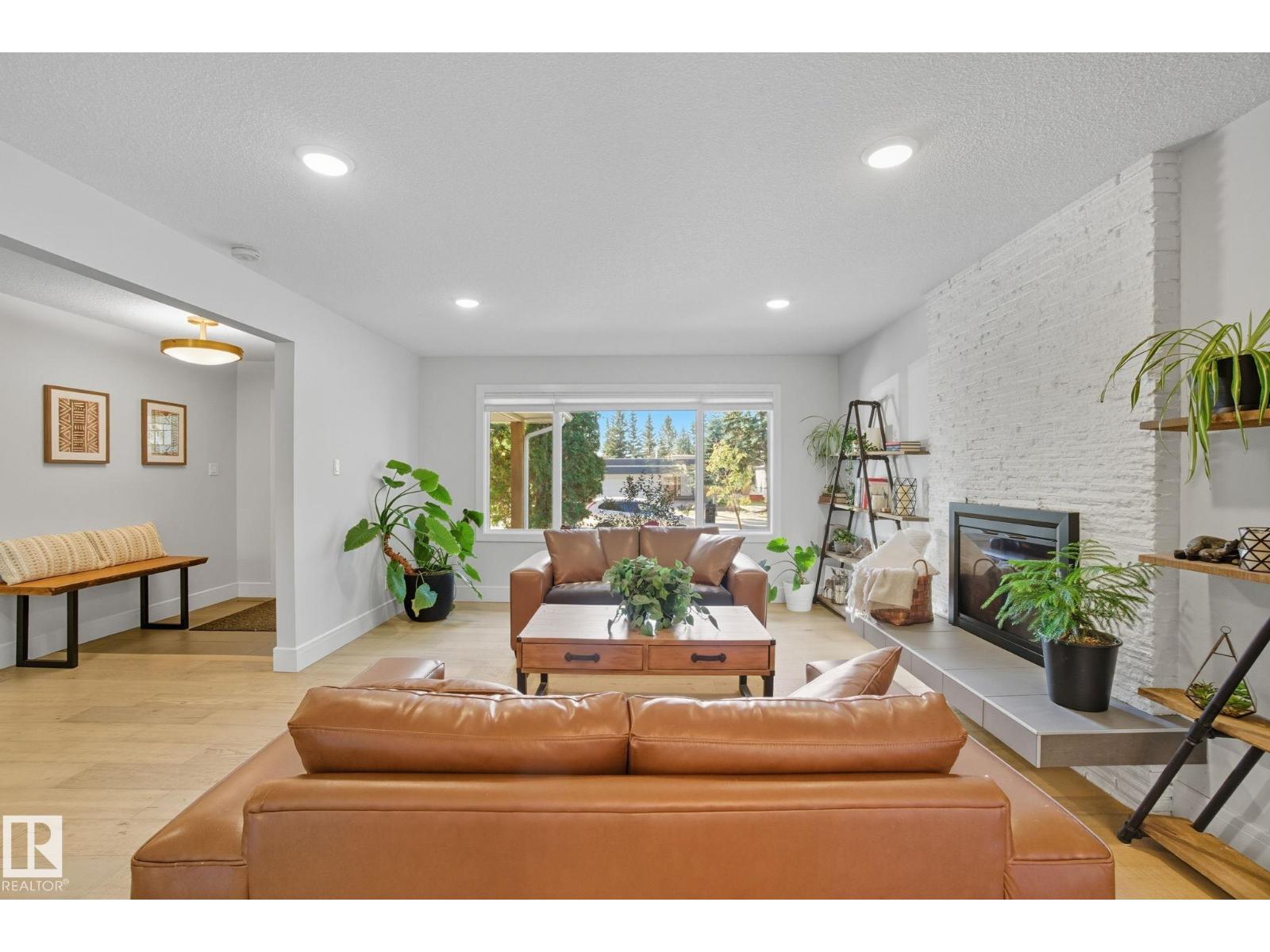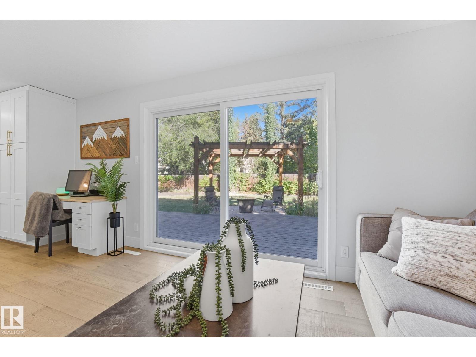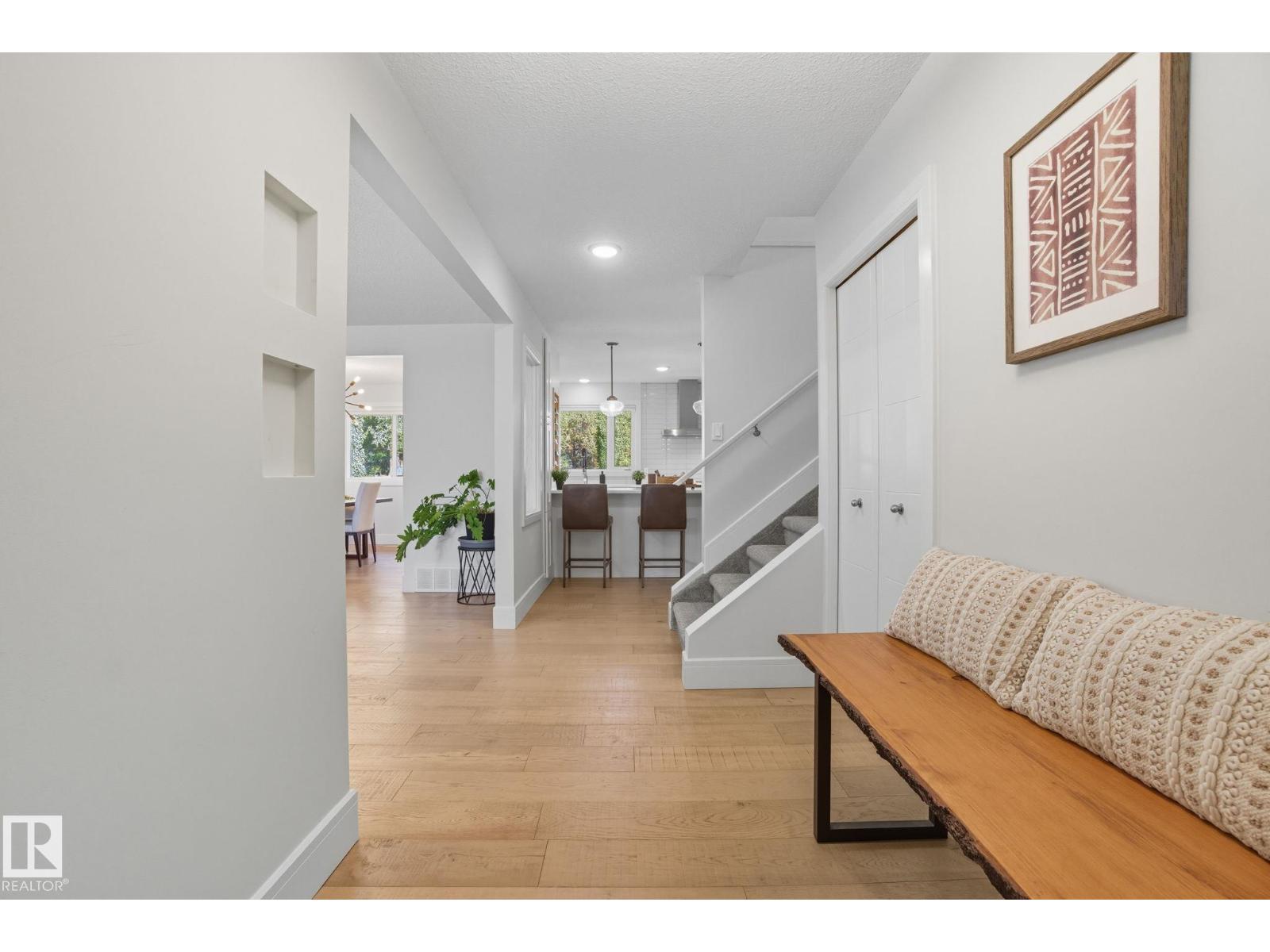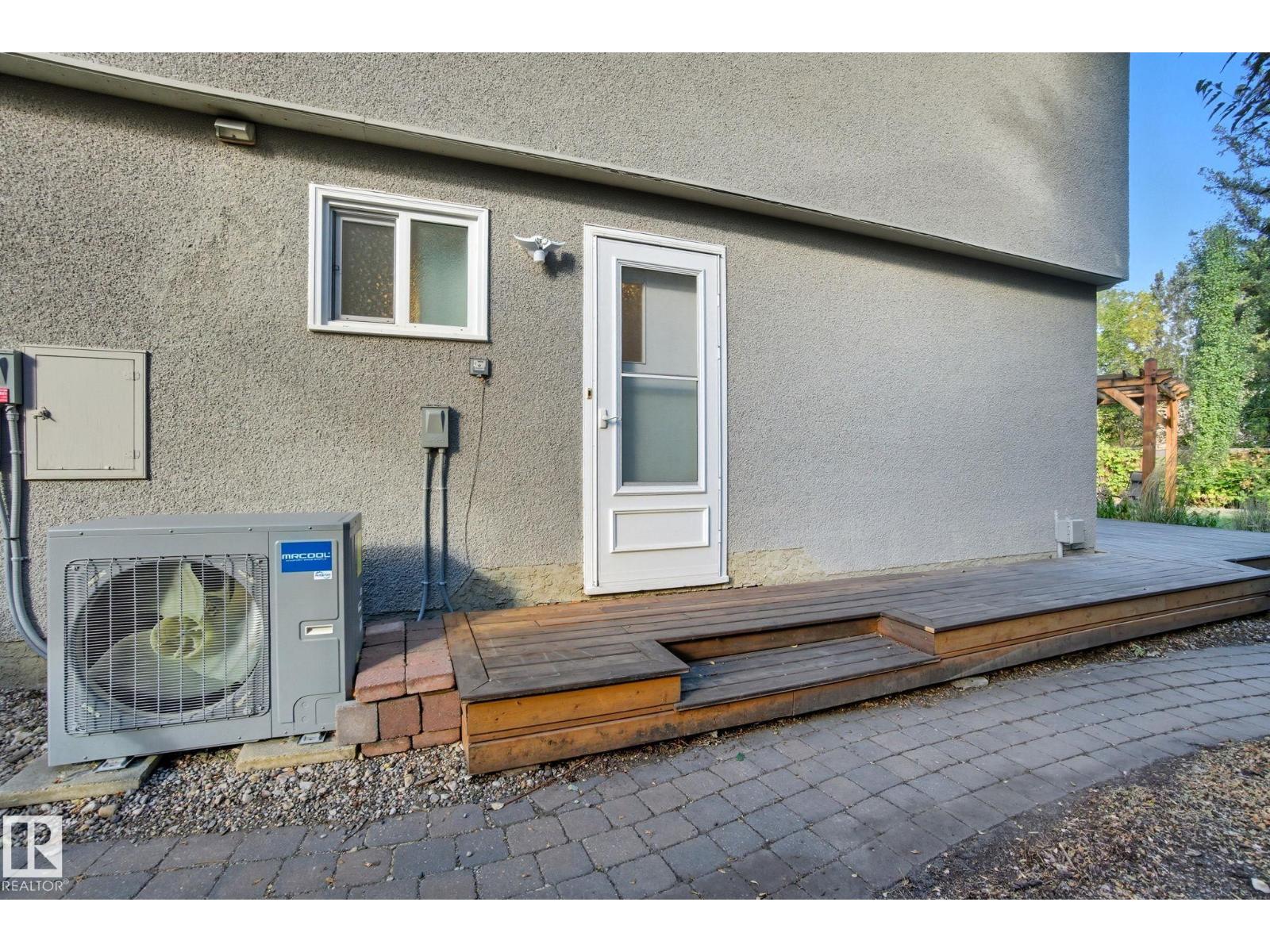 Solar-powered and fully renovated, perfectly positioned in one of Edmonton’s most desirable communities with Whitemud Ravine views right outside your front door. Paid-in-full solar panels efficiently run the heat pump and central A/C, plus a backup furnace, keeping comfort cost-effective year-round. Inside, modern updates blend with timeless style. The bright kitchen offers white cabinetry, quartz countertops, stainless steel appliances, and a large peninsula with seating, opening to the dining area. A wood-burning fireplace anchors the living room, while the family room leads to a private, fully fenced spacious backyard with deck and mature trees. Upstairs is a rare find with 4 generous sized bedrooms, including a primary suite and full ensuite. The finished basement adds a large rec room, bedroom, full bath, and storage. Additional features include main floor laundry, Hardie board exterior, new upstairs carpet, alley access with potential for a garden suite. (id:21083)