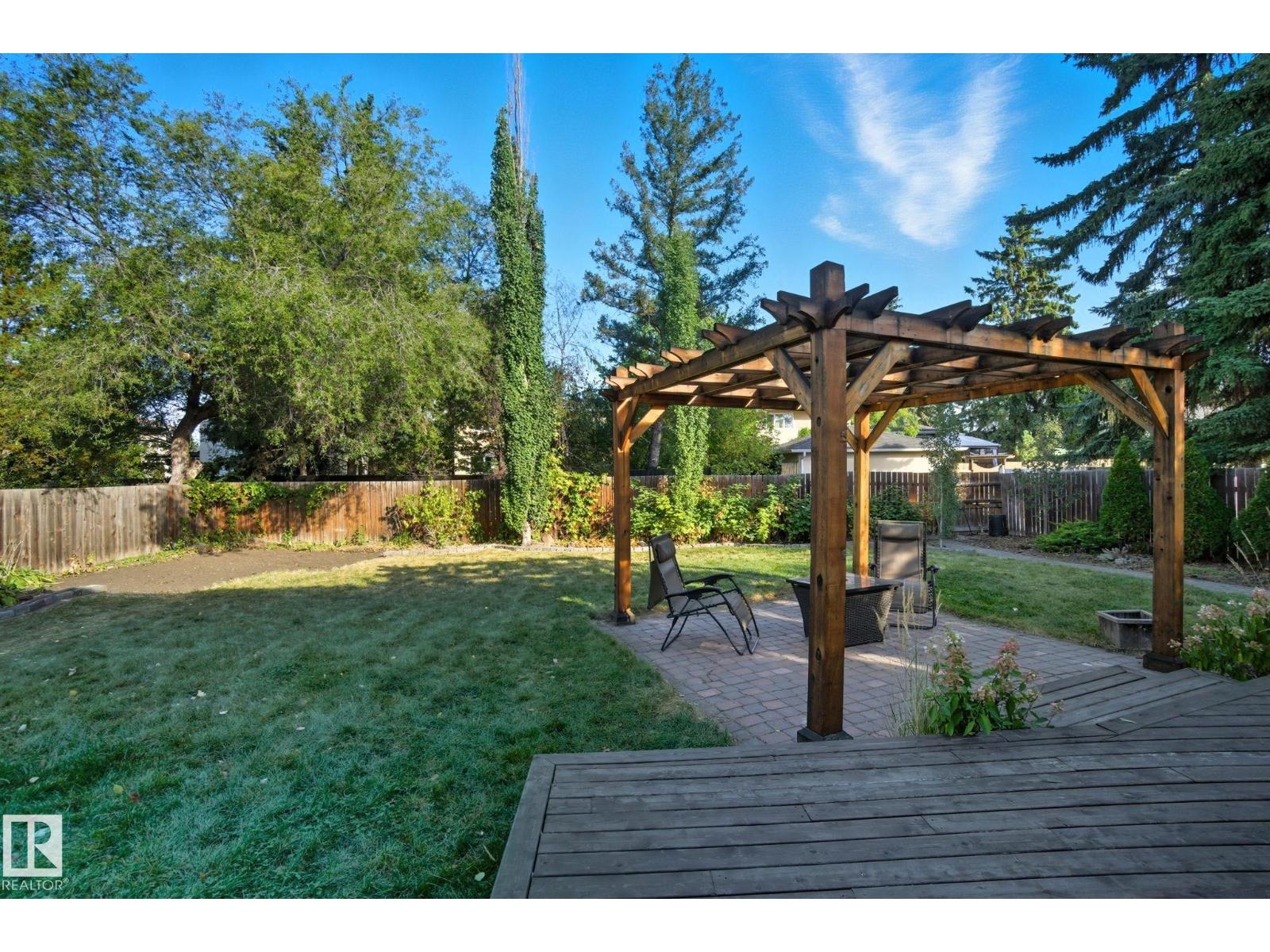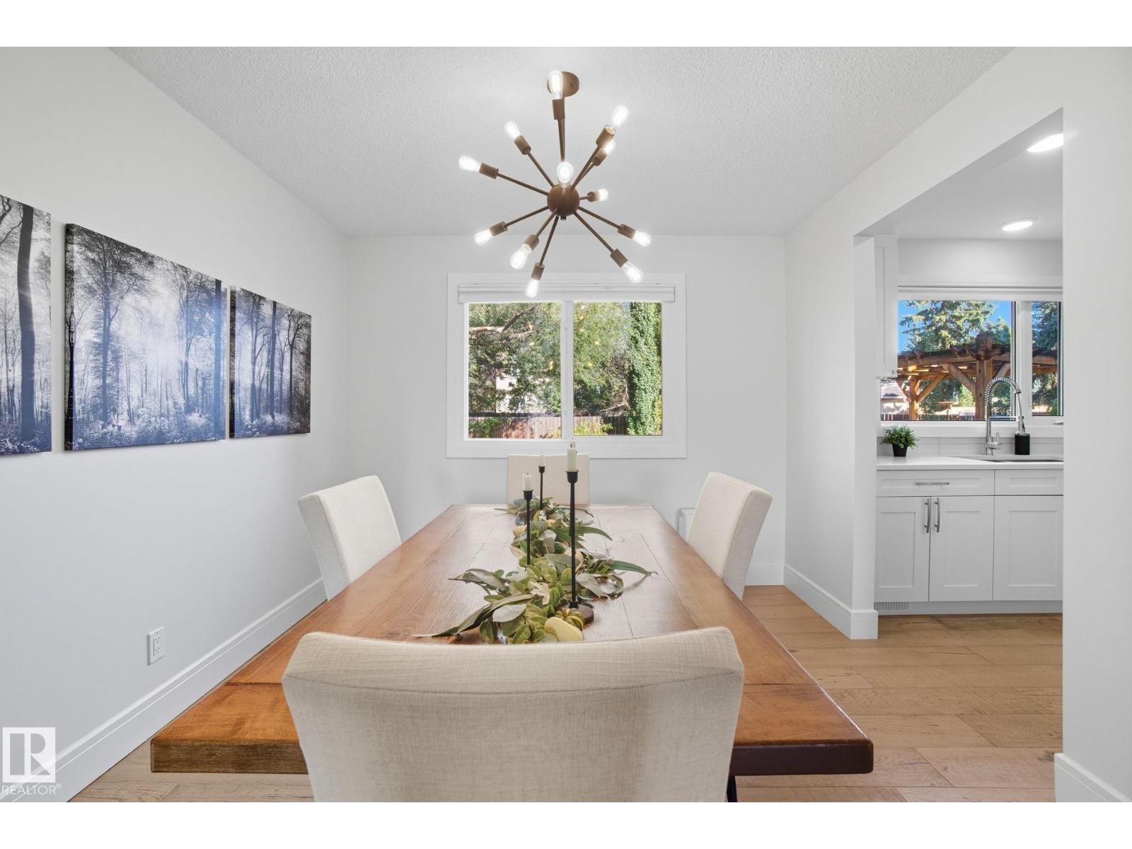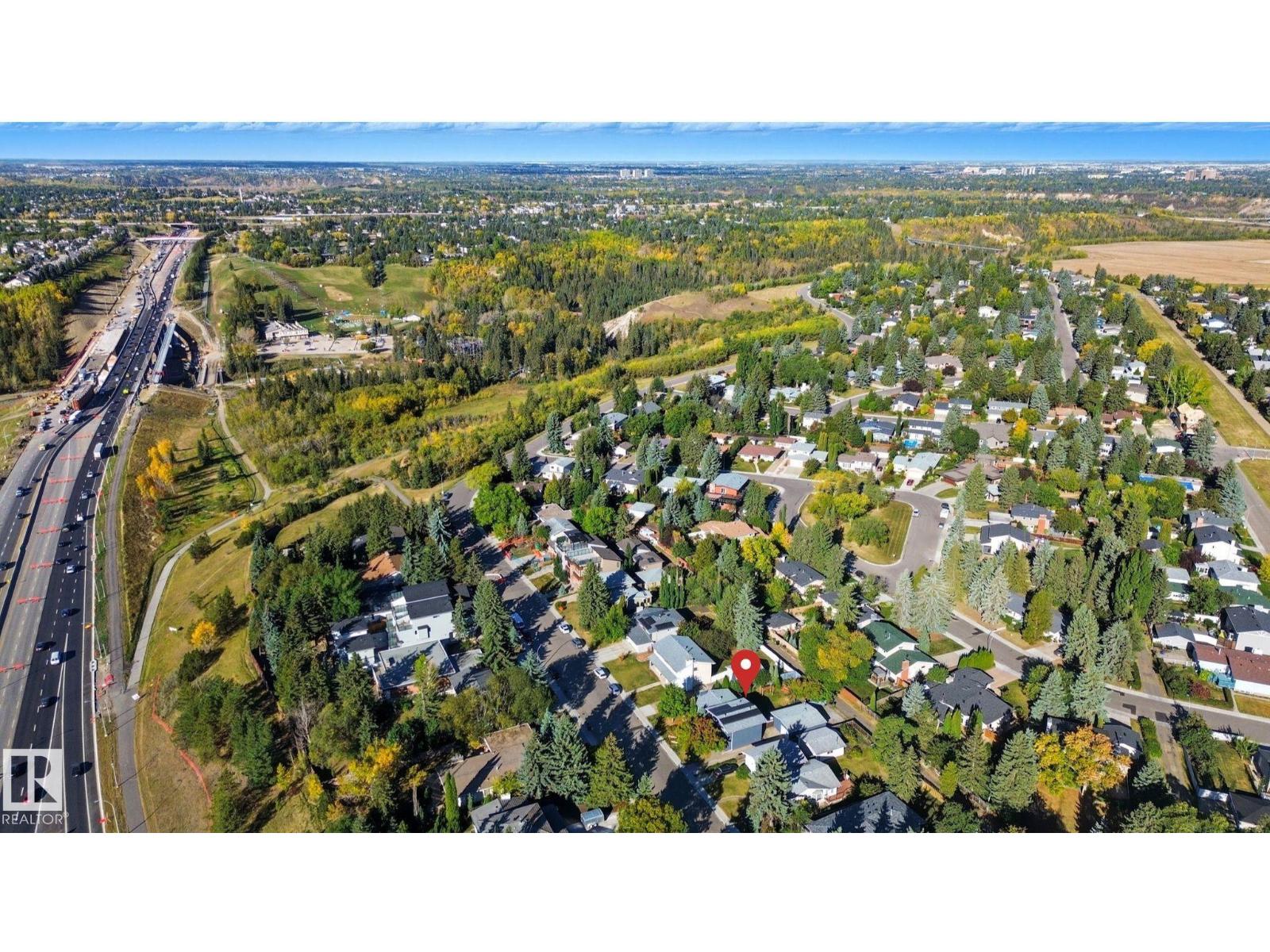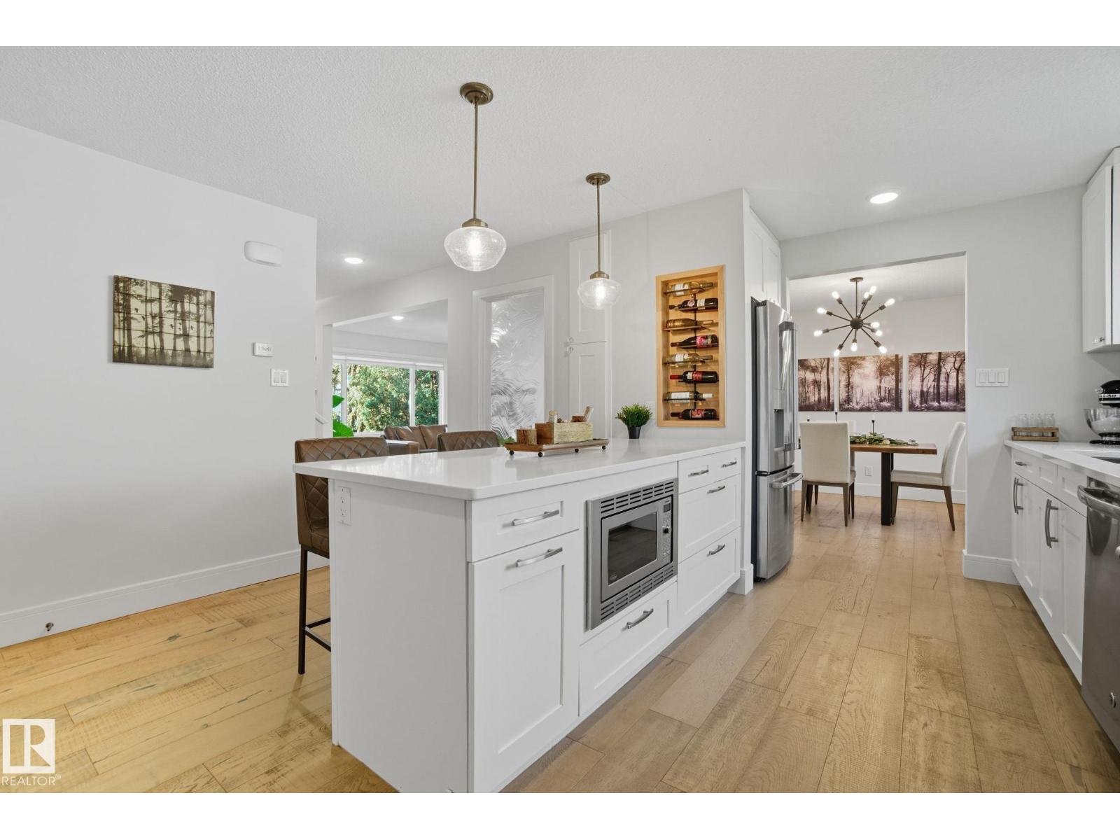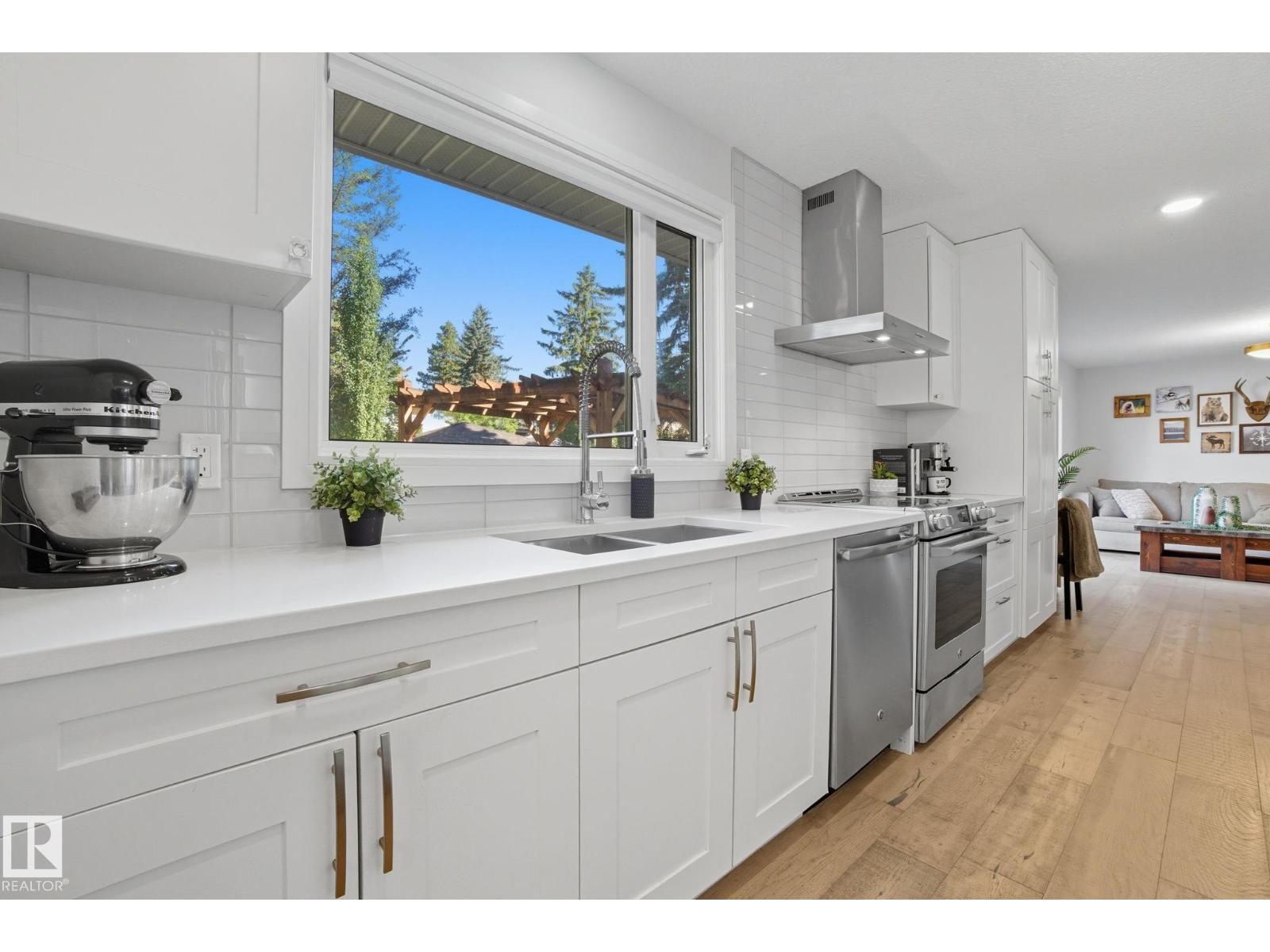 Solar-powered and fully renovated, perfectly positioned in one of Edmonton’s most desirable communities with Whitemud Ravine views right outside your front door. Paid-in-full solar panels efficiently run the heat pump and central A/C, plus a backup furnace, keeping comfort cost-effective year-round. Inside, modern updates blend with timeless style. The bright kitchen offers white cabinetry, quartz countertops, stainless steel appliances, and a large peninsula with seating, opening to the dining area. A wood-burning fireplace anchors the living room, while the family room leads to a private, fully fenced spacious backyard with deck and mature trees. Upstairs is a rare find with 4 generous sized bedrooms, including a primary suite and full ensuite. The finished basement adds a large rec room, bedroom, full bath, and storage. Additional features include main floor laundry, Hardie board exterior, new upstairs carpet, alley access with potential for a garden suite. (id:21083)