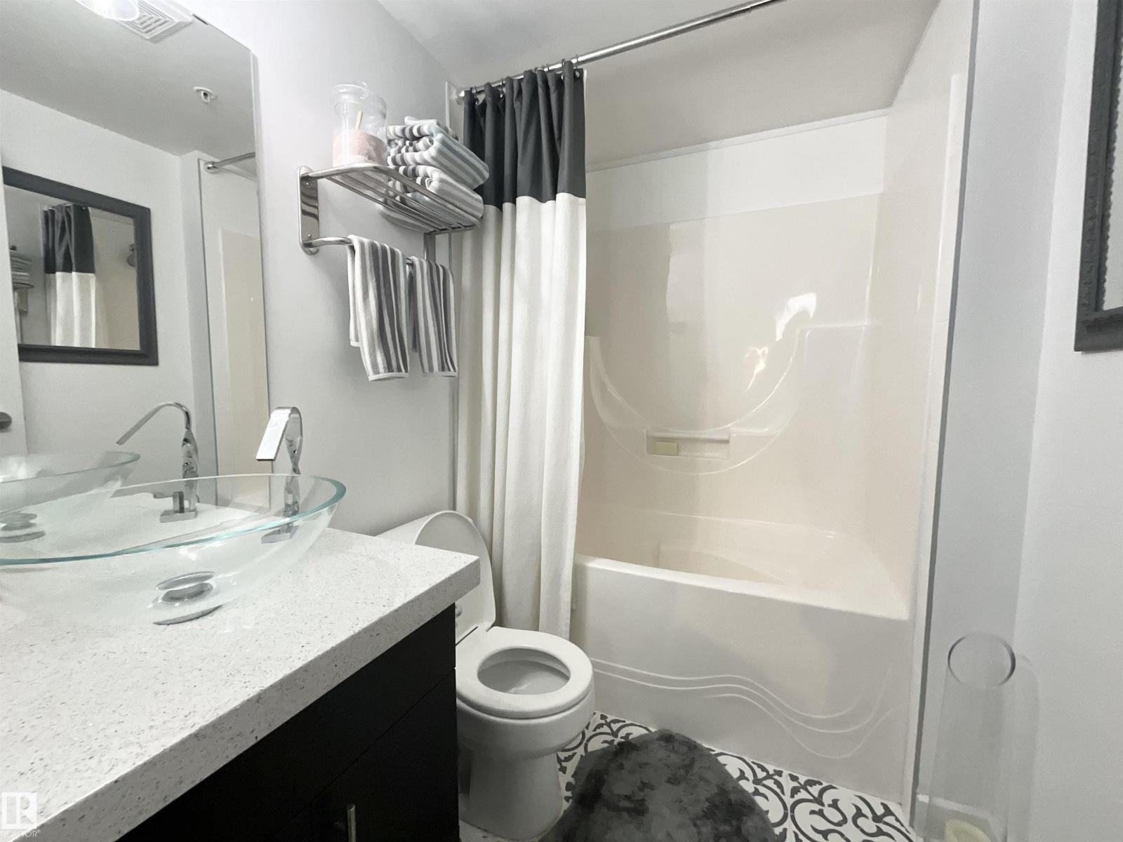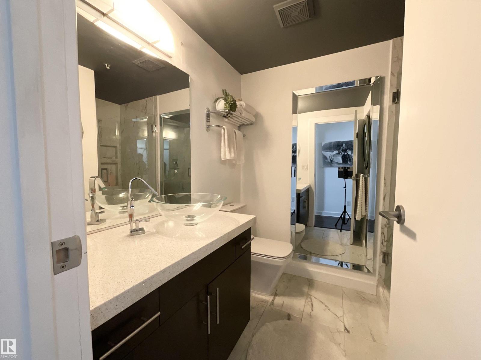 Experience downtown living at its absolute finest in this gorgeous high rise condo in the heart of Edmonton's city center. The pride of ownership is evident as this unit has been impeccably maintained and upgraded since it was constructed. The kitchen is open and bright with granite countertops and stainless steel appliances. Convenient barstool seating off the kitchen counter, with plenty of space for an additional dining room table. The main 3-piece washroom contains quartz countertops, marble flooring, and a spacious standup shower. The primary bedroom contains a sizeable closet, and an ensuite with a full bath and upgraded vanity. The centerpiece of the living room is a stunning, built-in electric fireplace, perfect to cozy up to around the holidays. Or, relax outside on the enormous balcony with breathtaking views of the city and skyline. Located steps away from shopping, grocery stores, Rogers Place, ICE District, and the LRT station. Titled, indoor parking to keep the vehicle warm and free of snow. (id:21083)
