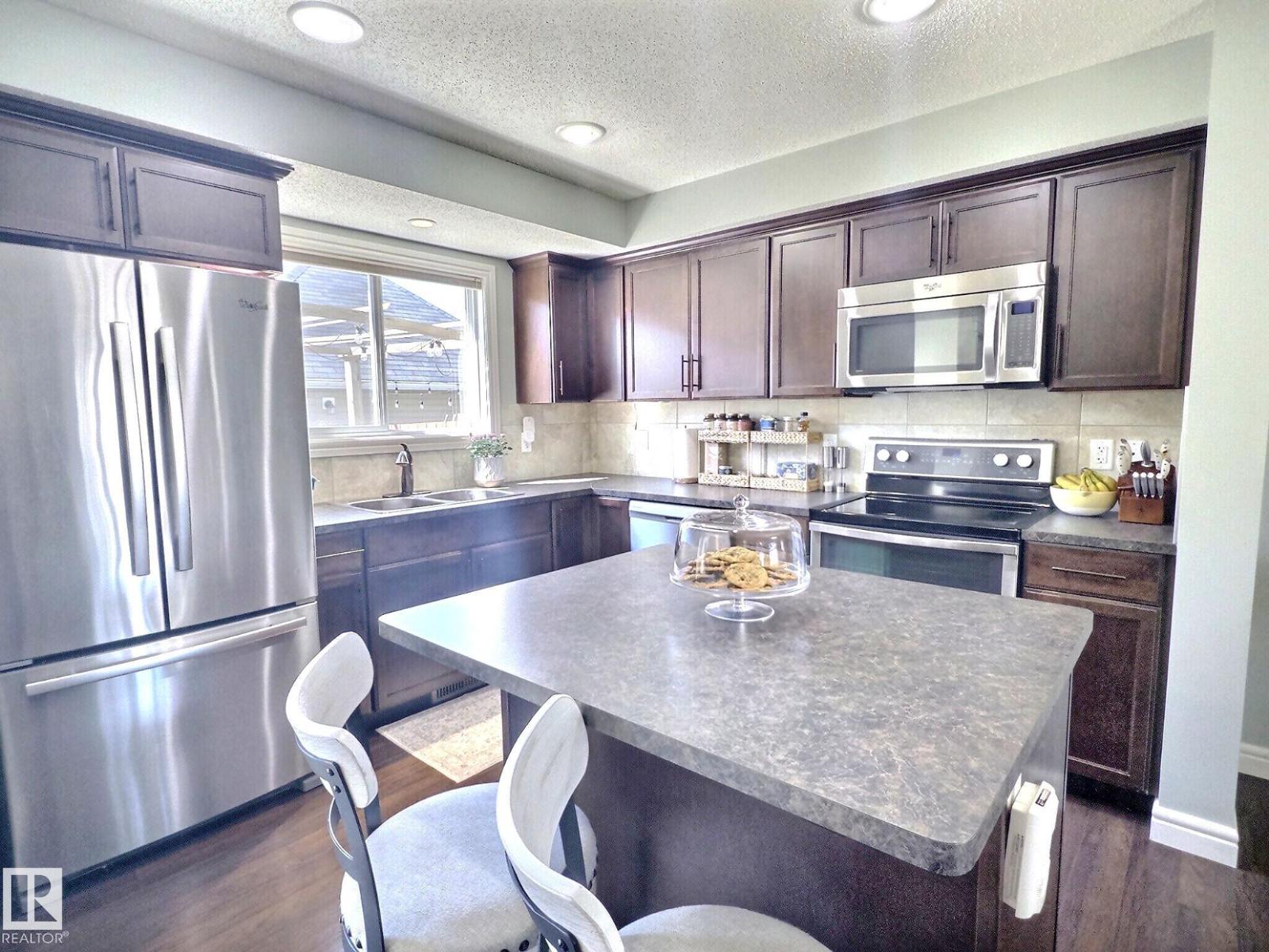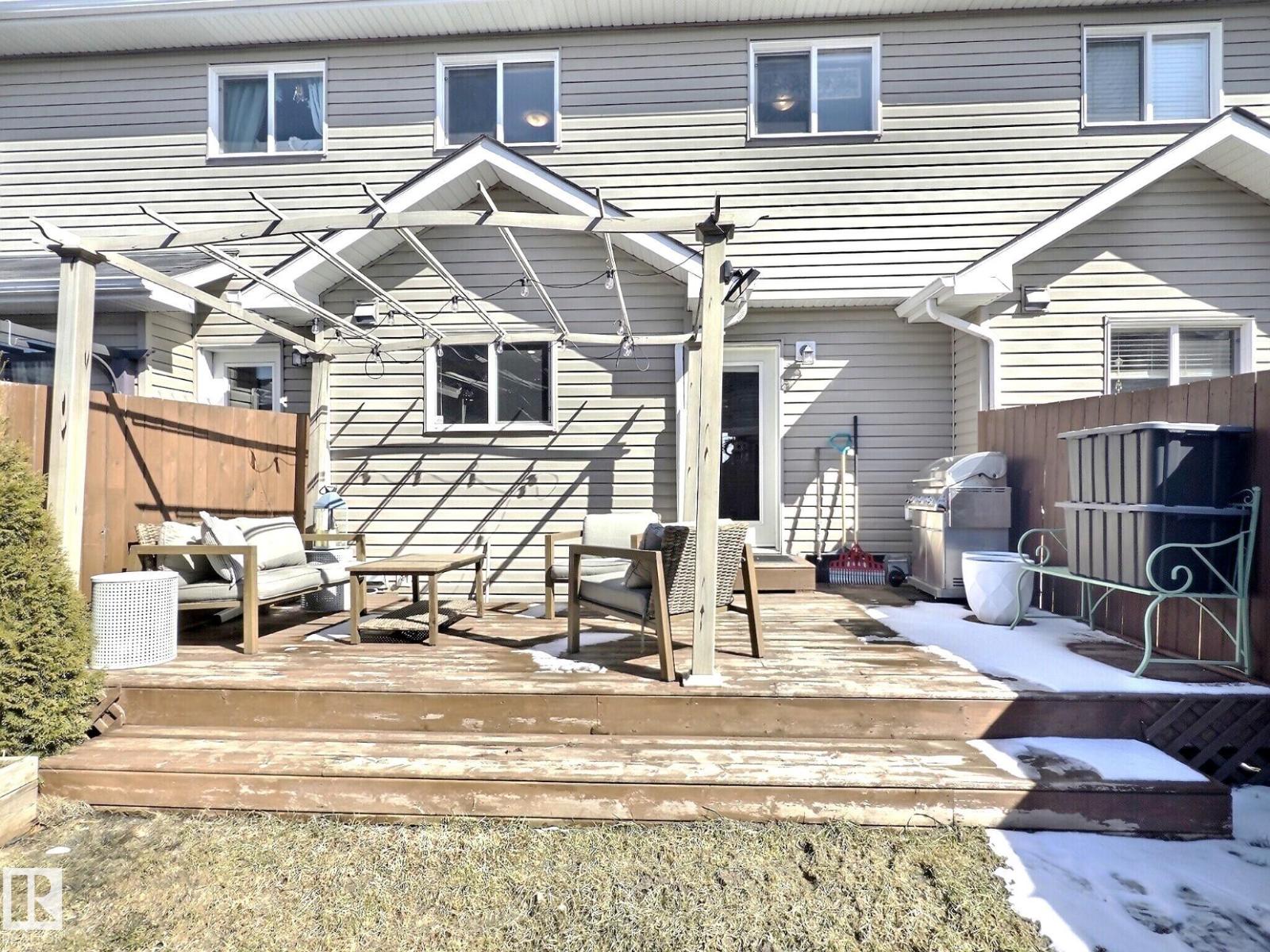 A charming, move-in ready townhouse, thoughtfully designed for modern living and free from condo fees. Step inside to an inviting open-concept main floor, with natural light through a large picture window in the front living room. The kitchen features warm wood cabinets, stainless steel appliances, a spacious island, with ample storage and worktop space. Through the back enjoy direct access to your private back garden, complete with a deck, and a double detached garage offering storage and parking spaces. Upstairs, discover three bedrooms and a full bathroom. The sizable primary suite is a peaceful retreat, featuring double closets and a stylish three-piece ensuite. The basement is partly finished, providing a flexible TV or games room, a laundry area, and abundant storage. Situated in a friendly community close to schools, shopping, playgrounds, golf courses, the airport, and main roadways. An exceptional opportunity for first-time buyers to enter the market or families looking to be close to the school. (id:21083)