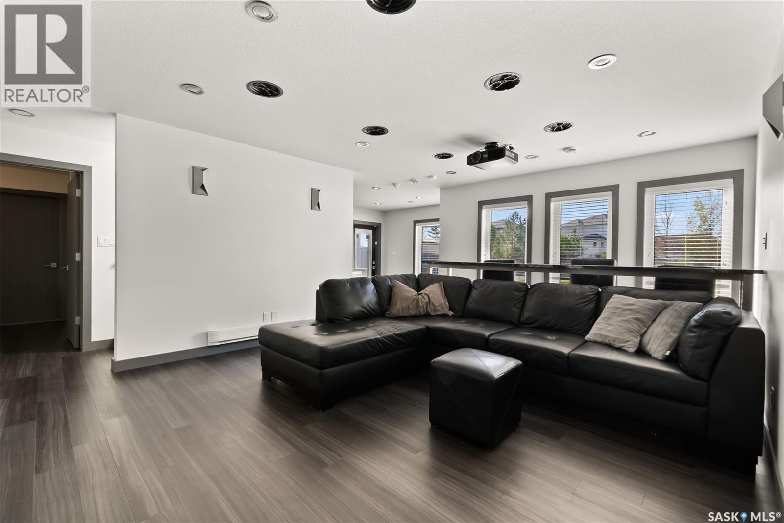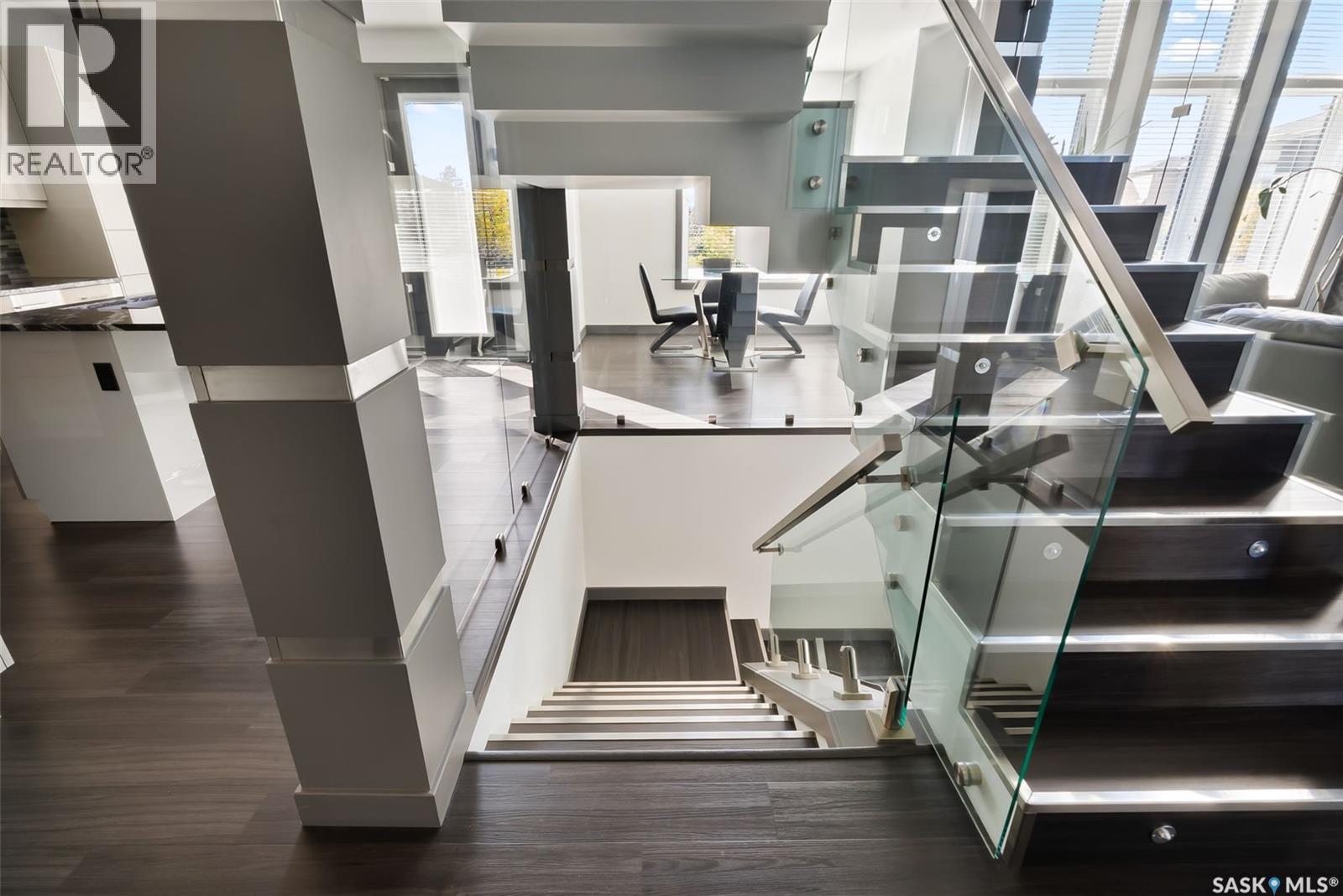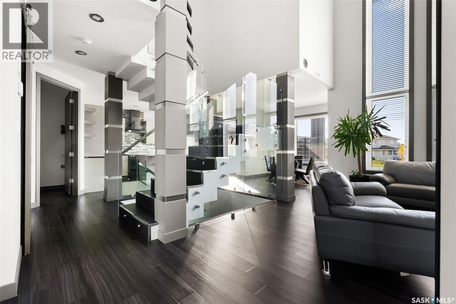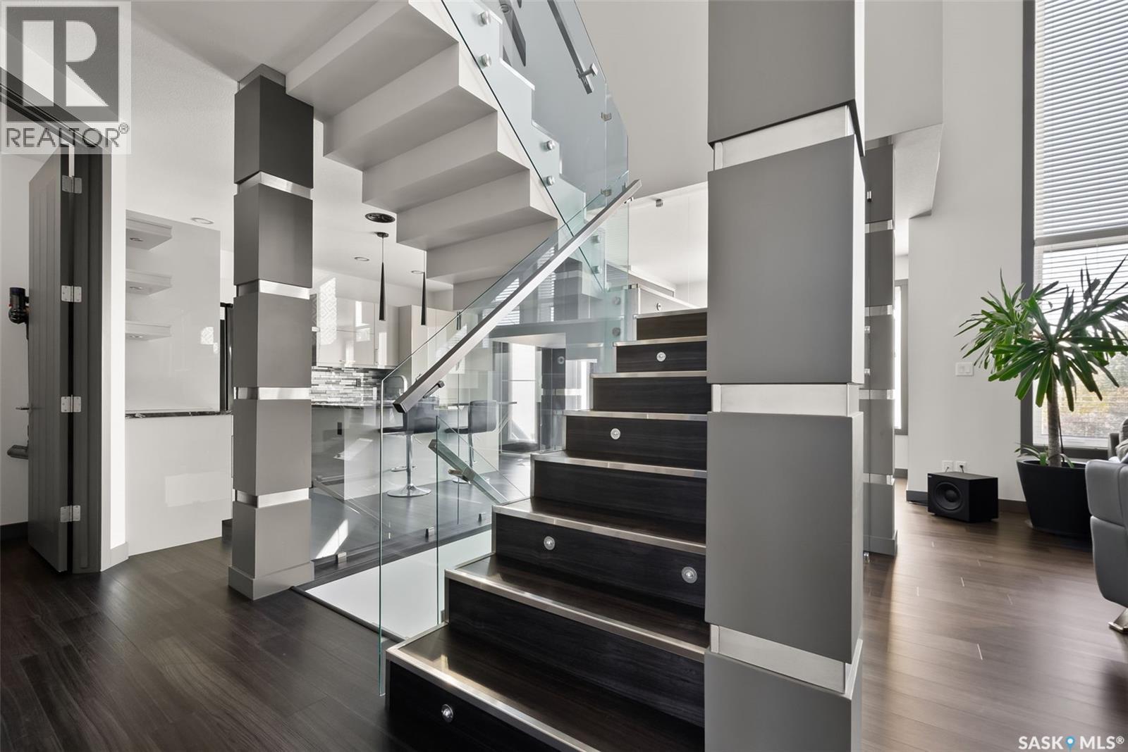 Welcome to this stunning custom-built walkout in Fairways West! This home is in a prime location and backs the beautiful walking path leading to the Goulet Golf Course. The moment you step inside, 19-foot ceilings and floor-to-ceiling windows create a dramatic sense of space and light. A striking glass-and-stainless steel staircase, accented with subtle stair lighting, introduces the home’s modern, refined style. The kitchen is both beautiful and practical, featuring custom white cabinetry, a generous sit-up island, granite countertops and premium stainless-steel appliances. There is garden door access from the kitchen which opens onto a private west-facing deck—ideal for morning coffee or evening entertaining while taking in the peaceful green space. Upstairs you’ll find the primary retreat, complete with a walk-in closet and a luxurious five-piece ensuite featuring dual vanities, a stand-alone soaker tub and a custom-tiled shower. Two additional bedrooms, a four-piece bath, and a convenient laundry room complete this level. The fully developed walkout basement is built for entertaining or unwinding after a long day. The rec room is set up as a perfect home theatre complete with a projector screen and built-in sound system! A sleek wet bar adds style and convenience, while the fourth bedroom doubles as a guest room, office, or home gym. Expansive windows keep the space bright and welcoming. The oversized double attached garage is a standout—heated, drywalled and equipped with 12-foot ceilings, a floor drain, and water taps. There are built-in speakers throughout the house and receivers are all included. Every detail in this home combines contemporary design with practical luxury. Discover a residence where craftsmanship and lifestyle meet in one exceptional property. This Fairways West show piece is one you do not want to miss out on! (id:21083)