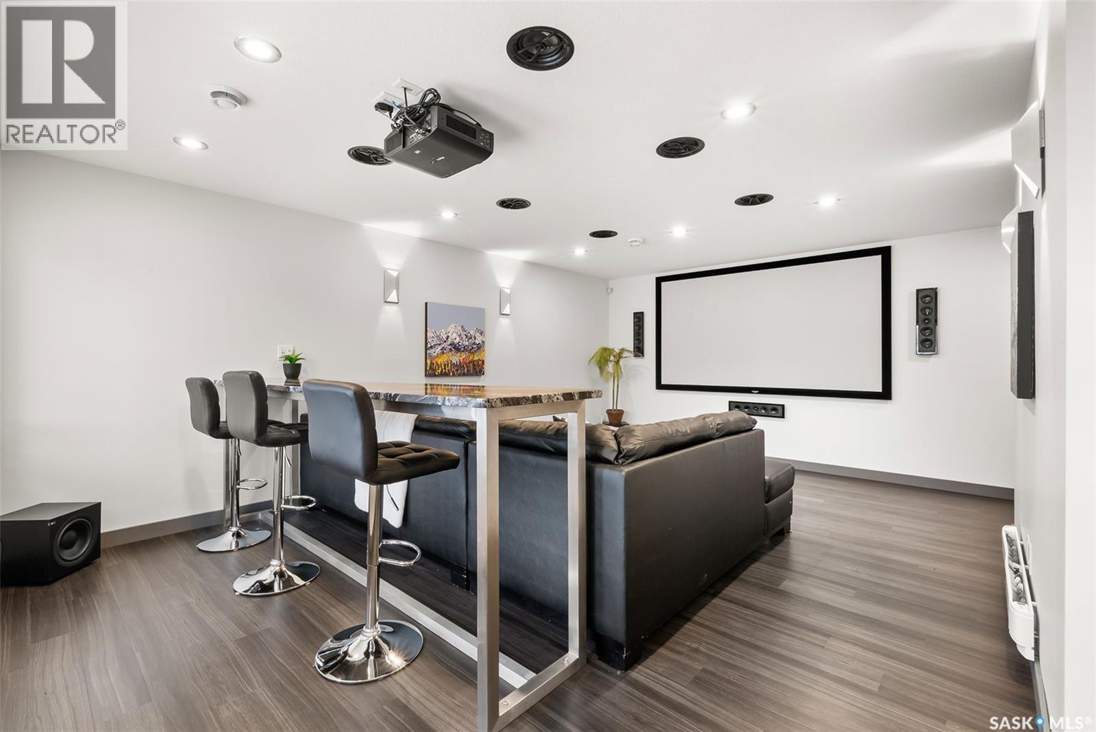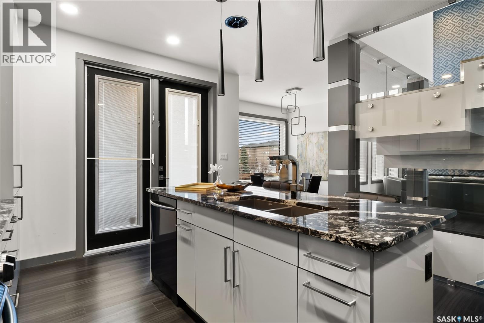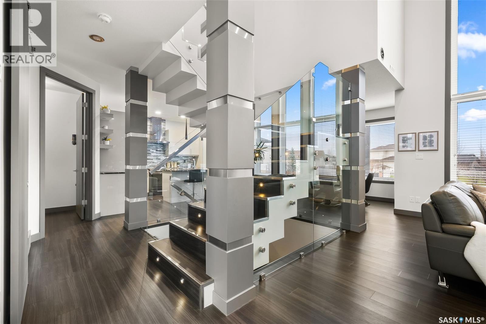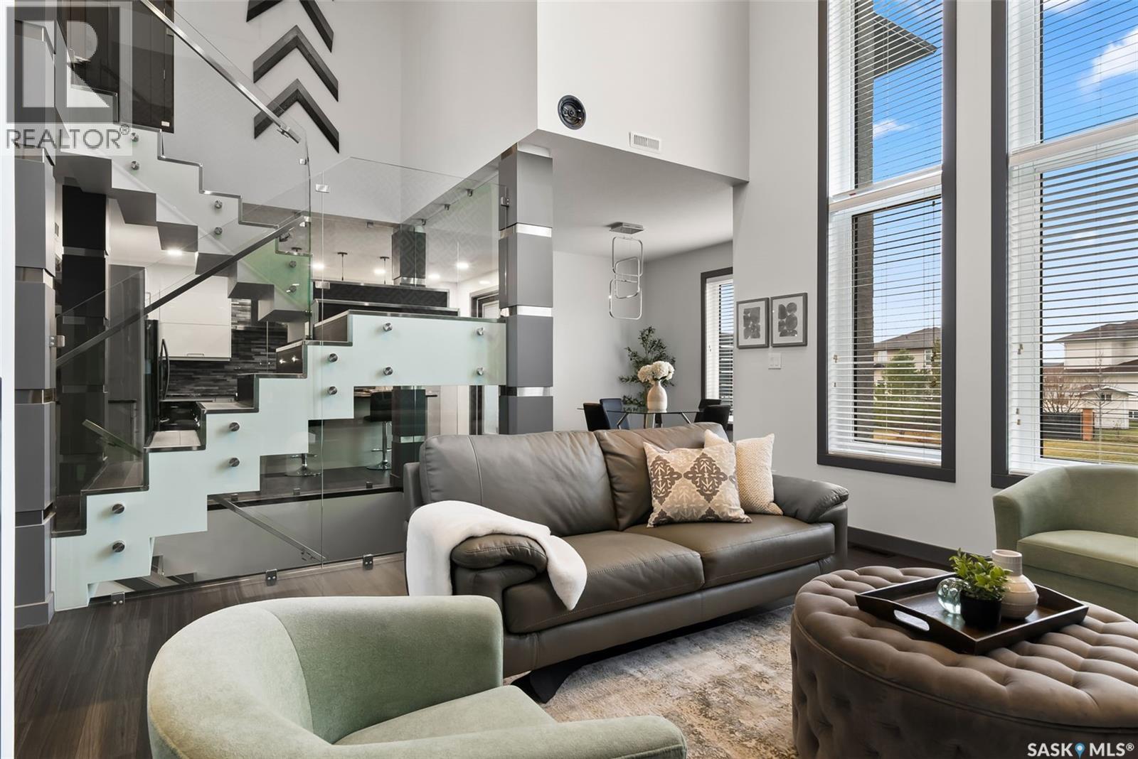 Welcome to this stunning custom-built walkout in Fairways West! This home is in a prime location and backs the beautiful walking path leading to the Goulet Golf Course. The moment you step inside, 19-foot ceilings and floor-to-ceiling windows create a dramatic sense of space and light. A striking glass-and-stainless steel staircase, accented with subtle stair lighting, introduces the home’s modern, refined style. The kitchen is both beautiful and practical, featuring custom white cabinetry, a generous sit-up island, granite countertops and premium stainless-steel appliances. There is garden door access from the kitchen which opens onto a private west-facing deck—ideal for morning coffee or evening entertaining while taking in the peaceful green space. Upstairs you’ll find the primary retreat, complete with a walk-in closet and a luxurious five-piece ensuite featuring dual vanities, a stand-alone soaker tub and a custom-tiled shower. Two additional bedrooms, a four-piece bath, and a convenient laundry room complete this level. The fully developed walkout basement is built for entertaining or unwinding after a long day. The rec room is set up as a perfect home theatre complete with a projector screen and built-in sound system! A sleek wet bar adds style and convenience, while the fourth bedroom doubles as a guest room, office, or home gym. Expansive windows keep the space bright and welcoming. The oversized double attached garage is a standout—heated, drywalled and equipped with 12-foot ceilings, a floor drain, and water taps. There are built-in speakers throughout the house and receivers are all included. Every detail in this home combines contemporary design with practical luxury. Discover a residence where craftsmanship and lifestyle meet in one exceptional property. This Fairways West show piece is one you do not want to miss out on! (id:21083)