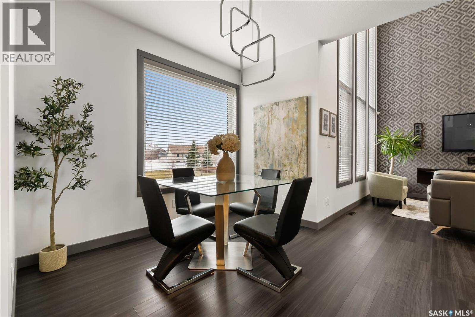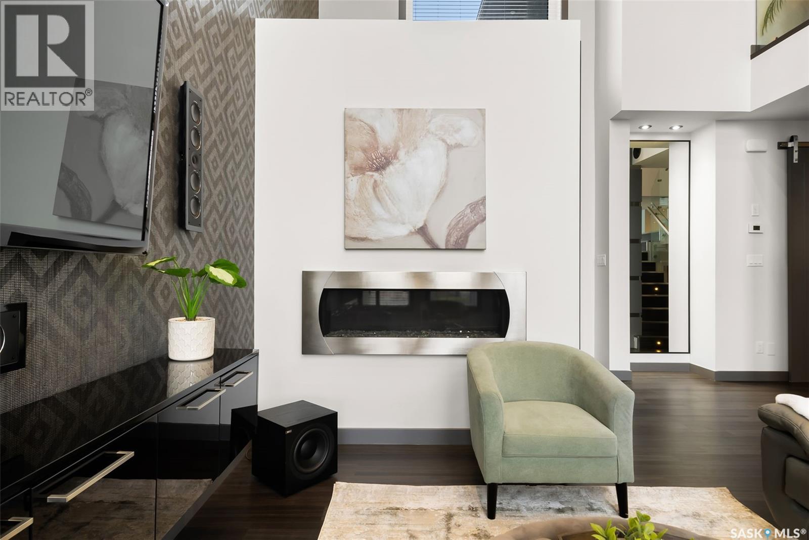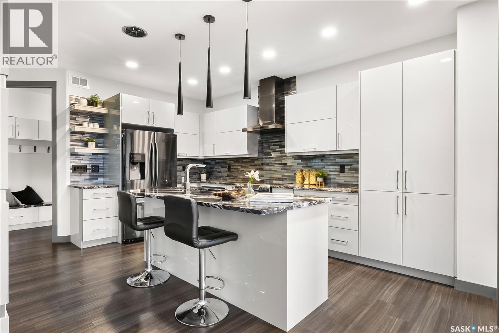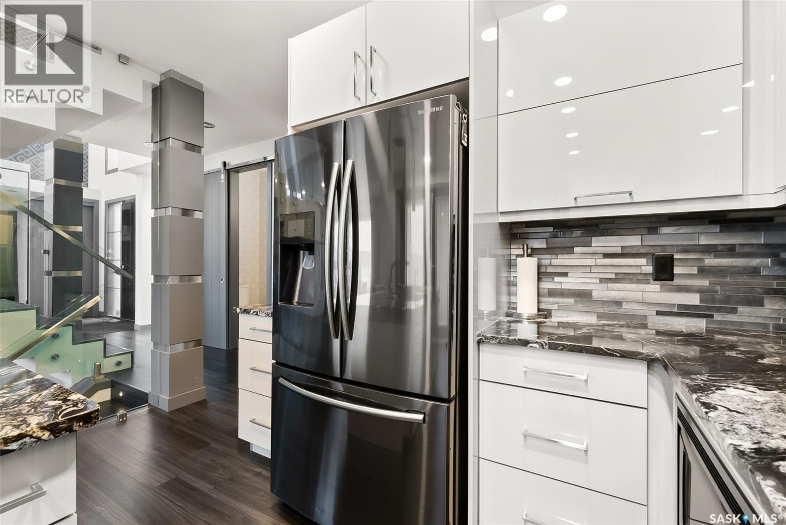 Welcome to this stunning custom-built walkout in Fairways West! This home is in a prime location and backs the beautiful walking path leading to the Goulet Golf Course. The moment you step inside, 19-foot ceilings and floor-to-ceiling windows create a dramatic sense of space and light. A striking glass-and-stainless steel staircase, accented with subtle stair lighting, introduces the home’s modern, refined style. The kitchen is both beautiful and practical, featuring custom white cabinetry, a generous sit-up island, granite countertops and premium stainless-steel appliances. There is garden door access from the kitchen which opens onto a private west-facing deck—ideal for morning coffee or evening entertaining while taking in the peaceful green space. Upstairs you’ll find the primary retreat, complete with a walk-in closet and a luxurious five-piece ensuite featuring dual vanities, a stand-alone soaker tub and a custom-tiled shower. Two additional bedrooms, a four-piece bath, and a convenient laundry room complete this level. The fully developed walkout basement is built for entertaining or unwinding after a long day. The rec room is set up as a perfect home theatre complete with a projector screen and built-in sound system! A sleek wet bar adds style and convenience, while the fourth bedroom doubles as a guest room, office, or home gym. Expansive windows keep the space bright and welcoming. The oversized double attached garage is a standout—heated, drywalled and equipped with 12-foot ceilings, a floor drain, and water taps. There are built-in speakers throughout the house and receivers are all included. Every detail in this home combines contemporary design with practical luxury. Discover a residence where craftsmanship and lifestyle meet in one exceptional property. This Fairways West show piece is one you do not want to miss out on! (id:21083)